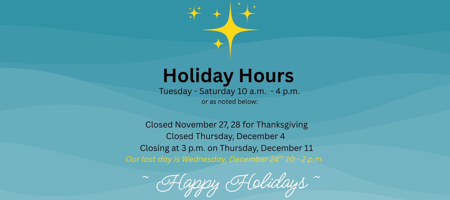 Our last day to shop in store is Wednesday, December 24th until 2:00 p.m.