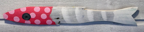 Charlie Merrill sources the pickets by locating weathered fences from local farms and homesteads in Maine. He cuts, sands, primes and adds hardware to each piece. The quality never varies. Otty Merrill is the artist who paints each fish individually. The designs vary slightly from batch to batch attesting to the handpainted nature of the work & the whim of the artist.